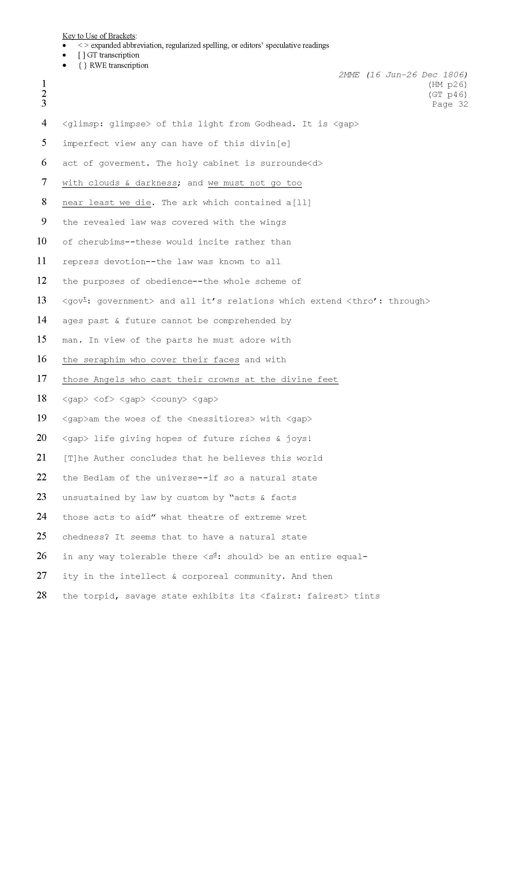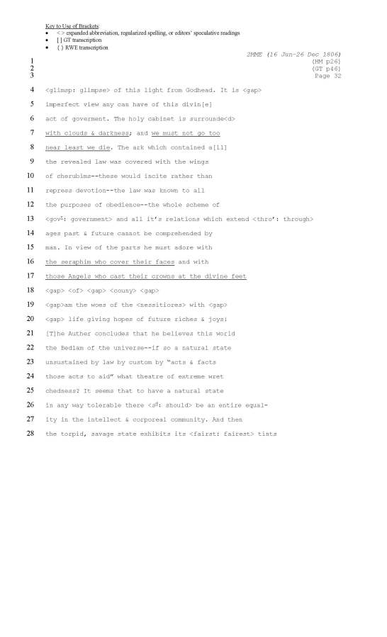 Editors’ transcription of Mary Moody Emerson’s 1806 Almanack, page 32, including instances in which Ralph Waldo Emerson and George Tolman can supply words for irrecoverably damaged text.