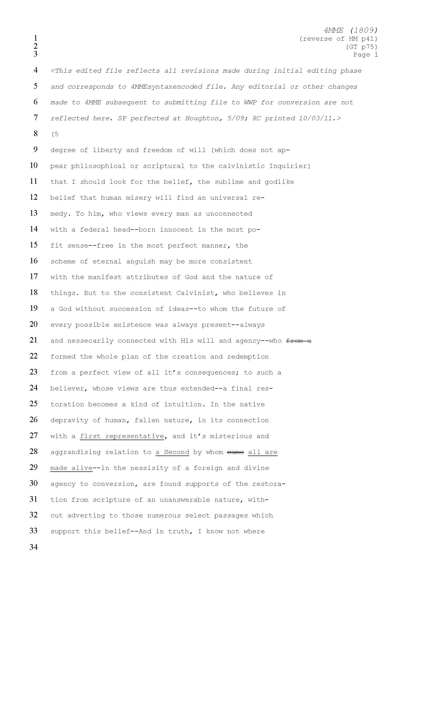 Editors’ transcription of Mary Moody Emerson’s 1809 Almanack Fascicle, page 1, including instances in which Ralph Waldo Emerson and George Tolman can supply words for irrecoverably damaged text.