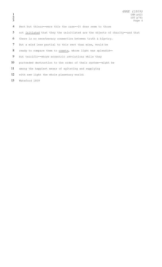 Editors’ transcription of Mary Moody Emerson’s 1809 Almanack Fascicle, page 4, including instances in which Ralph Waldo Emerson and George Tolman can supply words for irrecoverably damaged text.